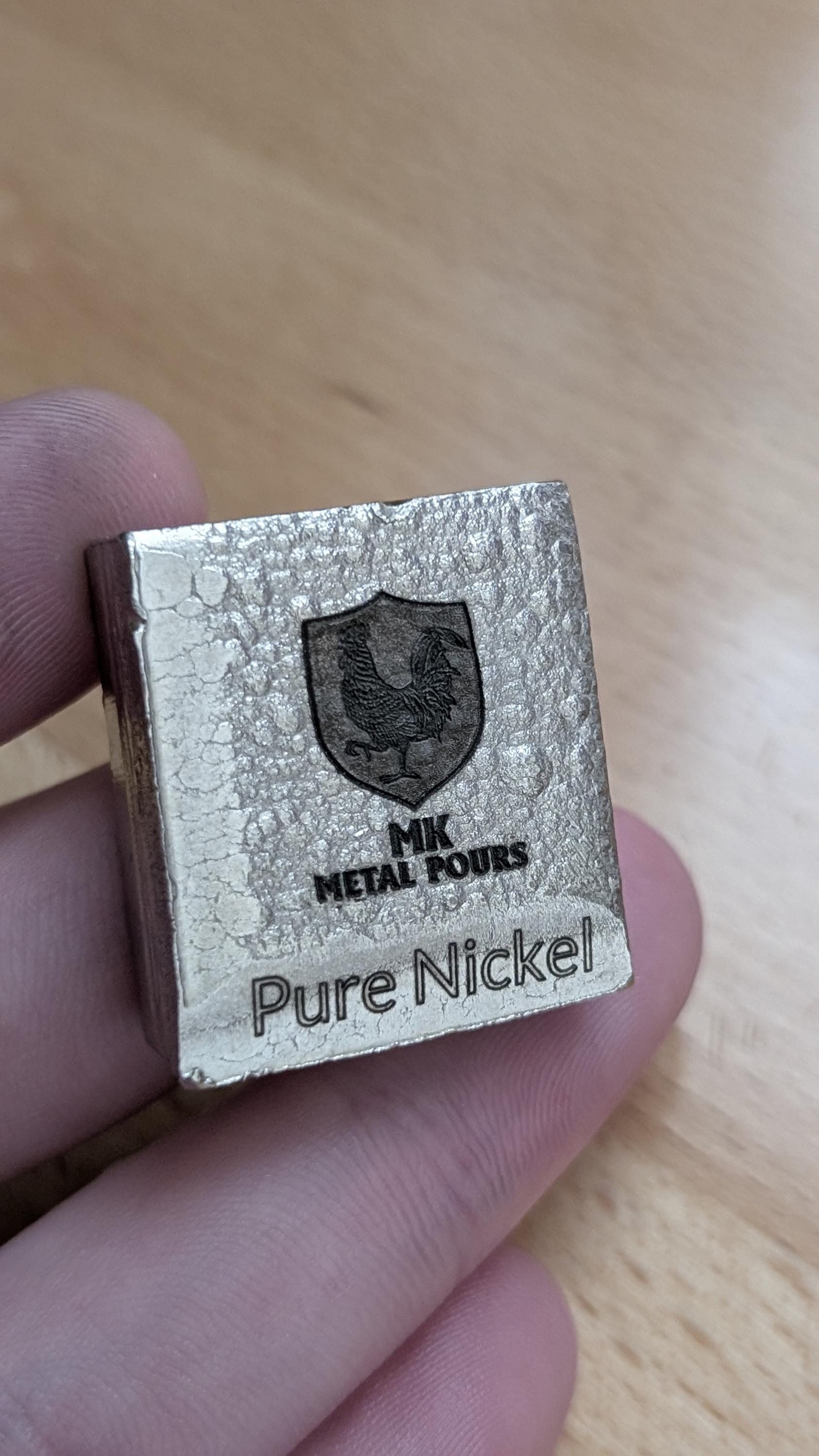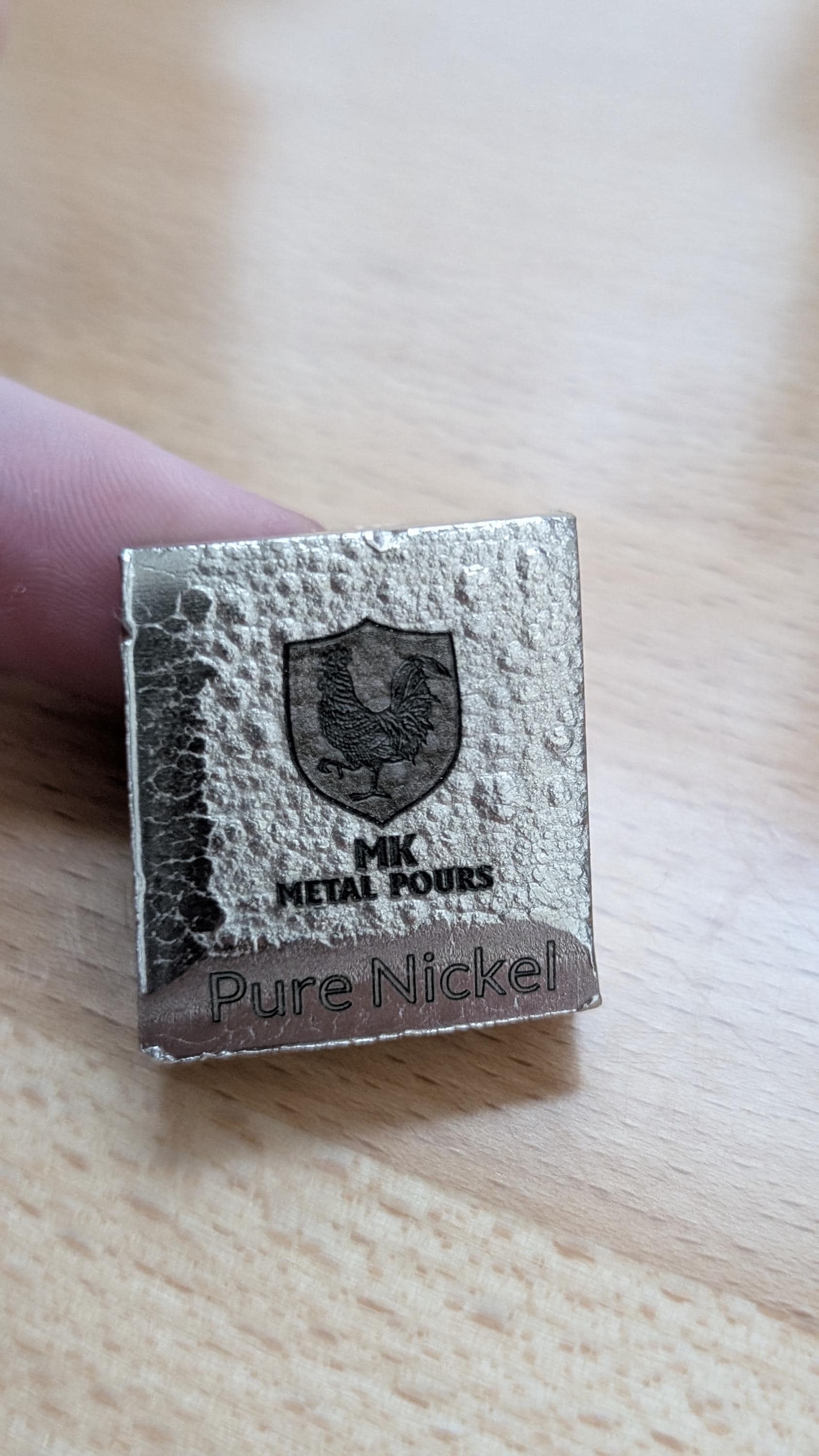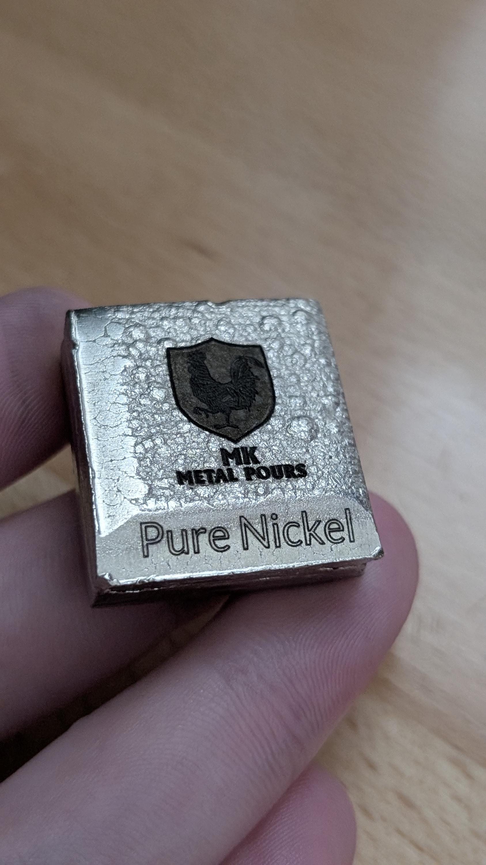 Solid 99.9% pure nickel bar engraved on both sides: a detailed fig branch on the front and a rooster crest with MK Metal Pours on the back. Heavy in the hand, corrosion-resistant, and built to last, this bar is both a collectible art piece and elemental metal for serious collectors.