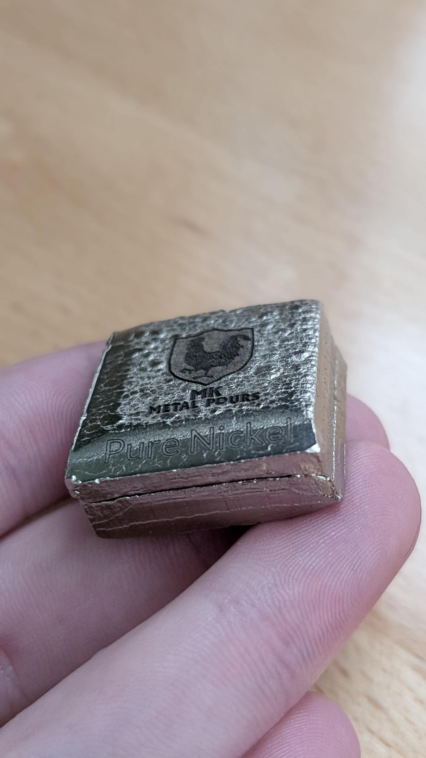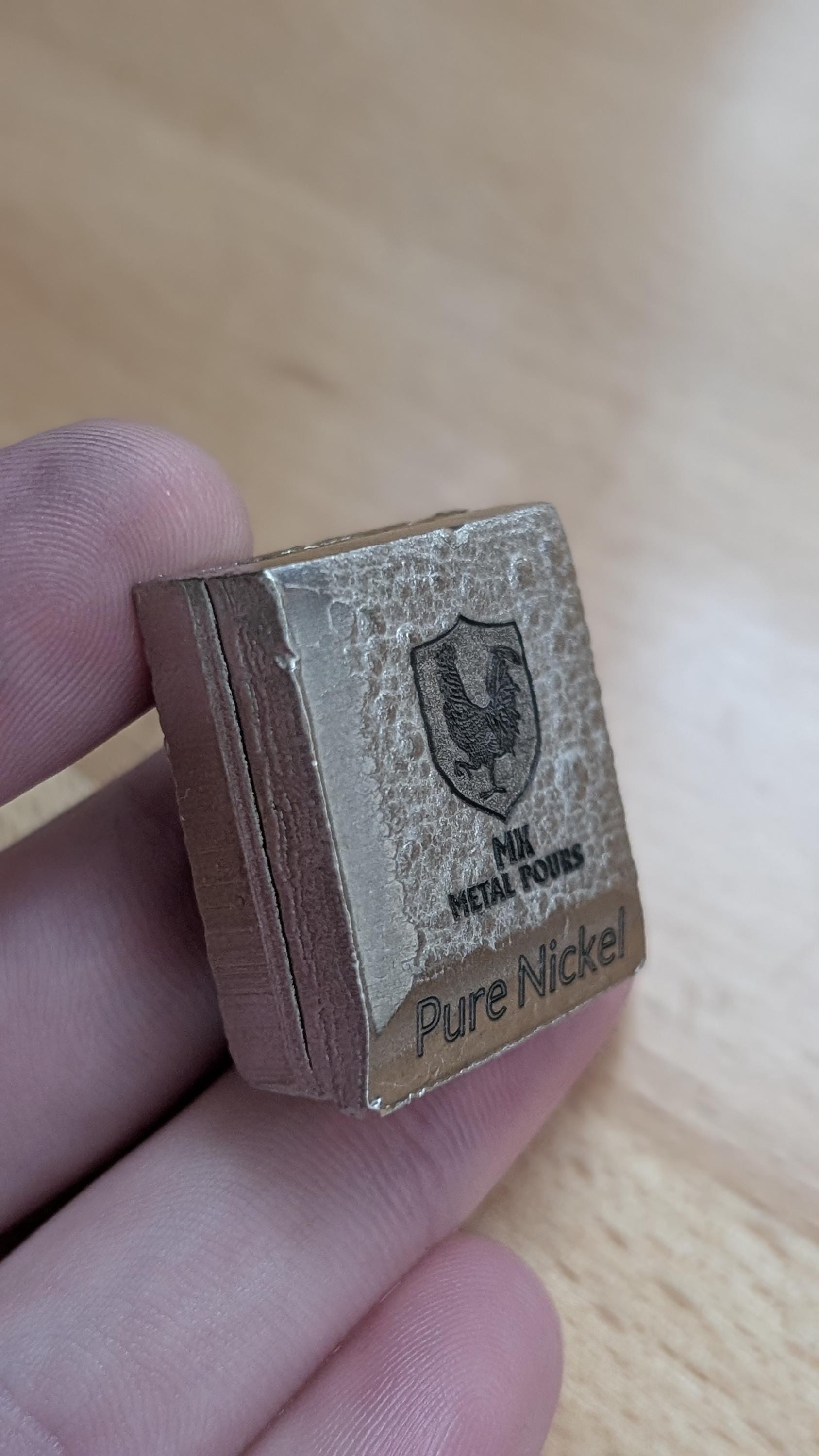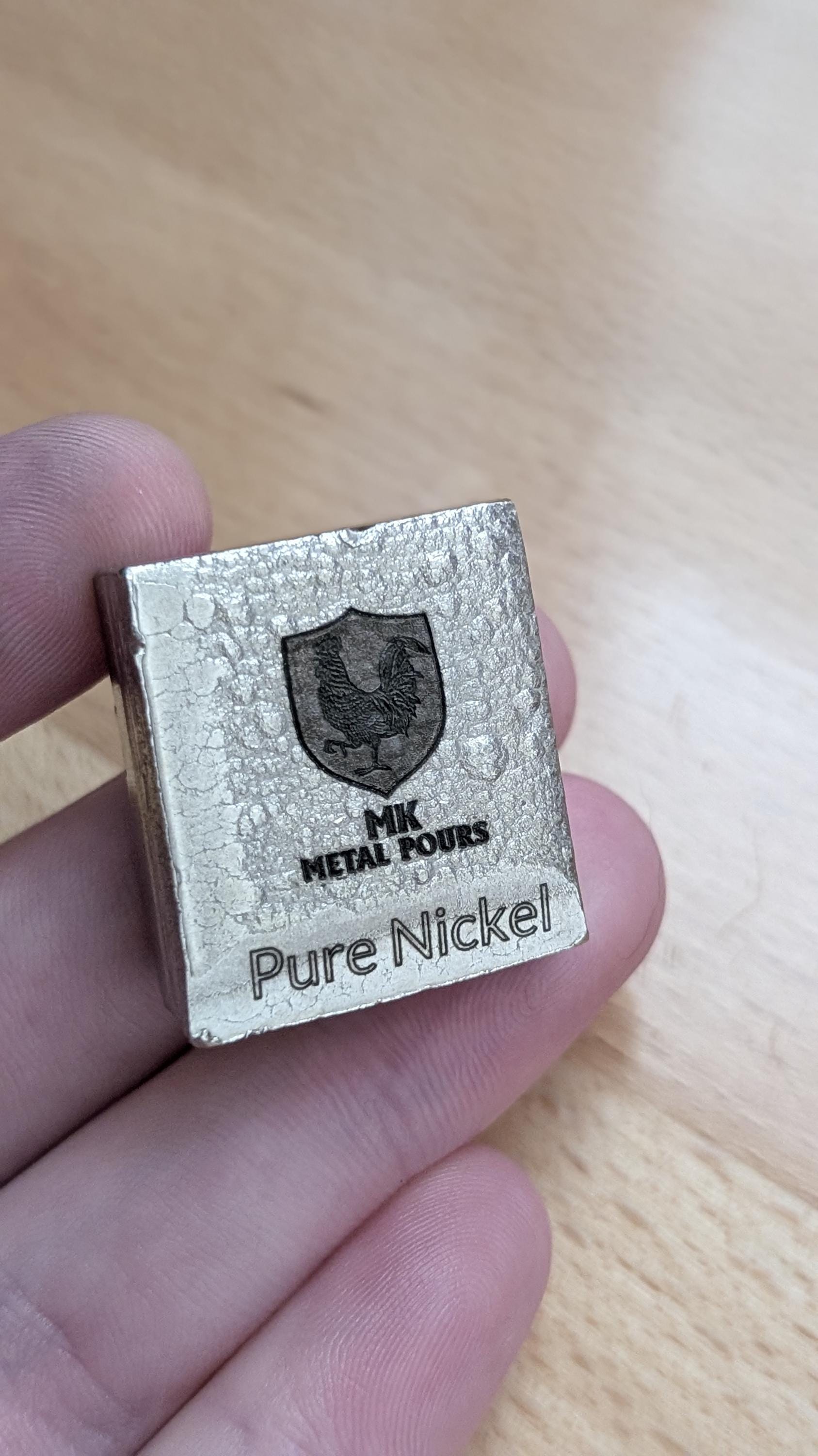 Solid 99.9% pure nickel bar engraved on both sides: a detailed fig branch on the front and a rooster crest with MK Metal Pours on the back. Heavy in the hand, corrosion-resistant, and built to last, this bar is both a collectible art piece and elemental metal for serious collectors.