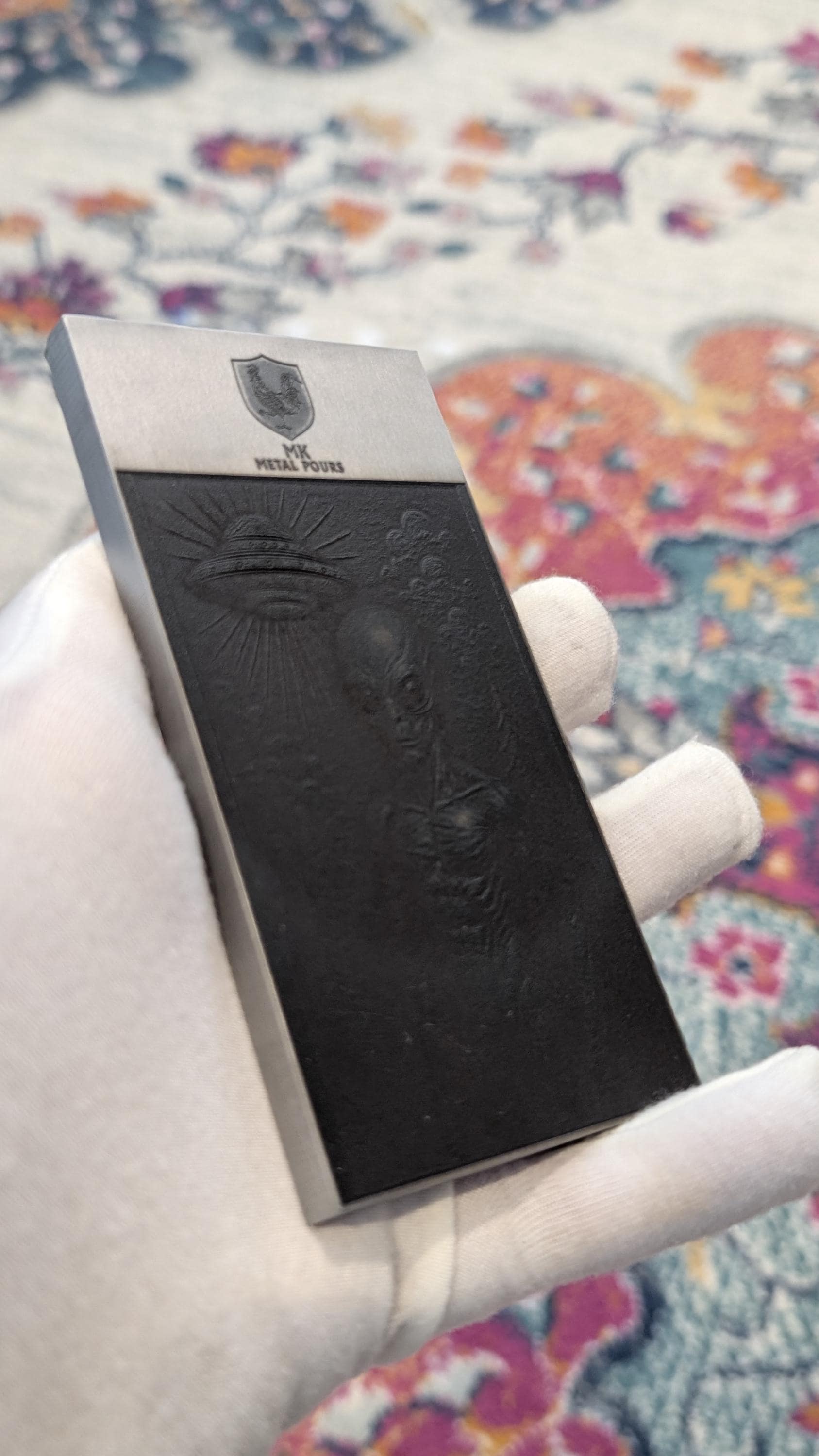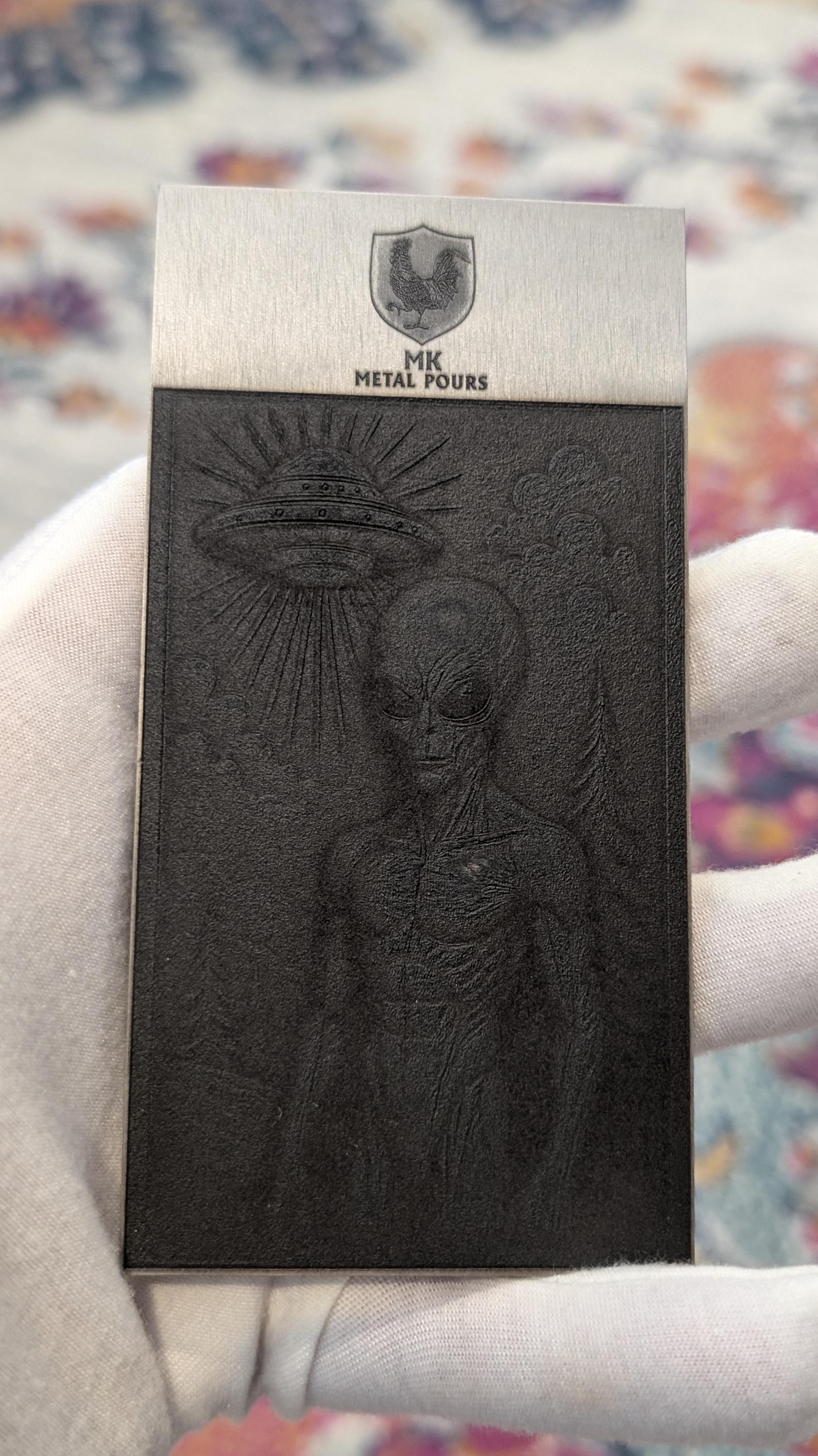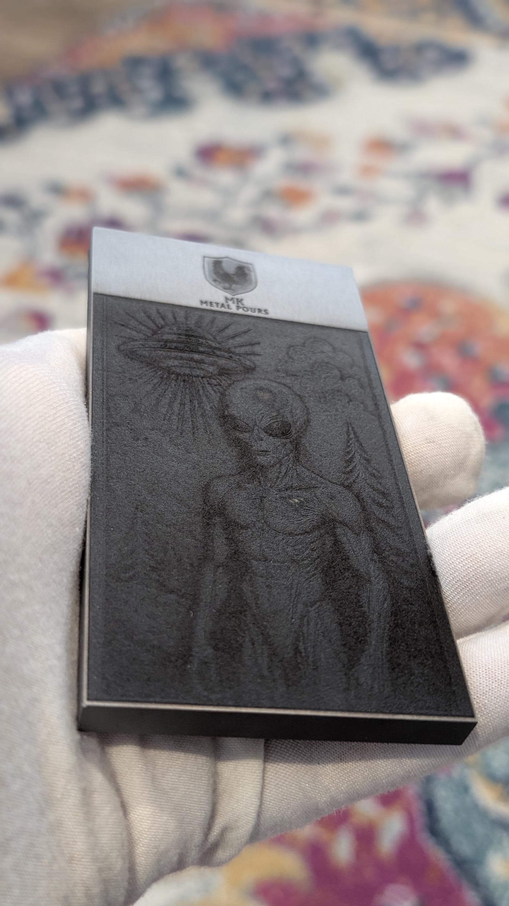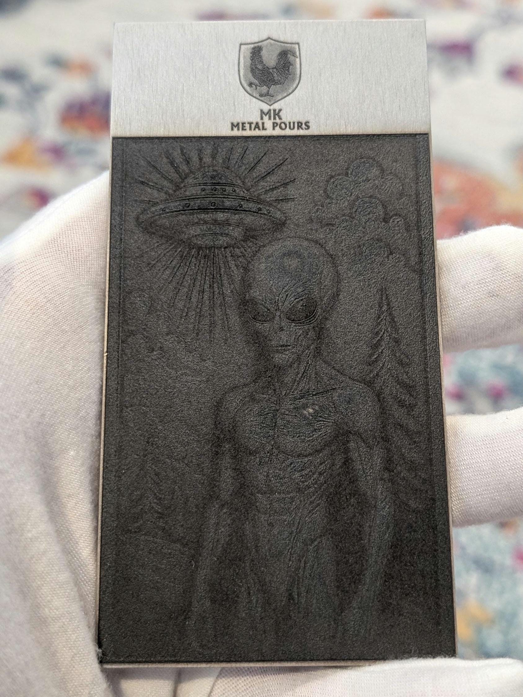 After engraving, the piece weighs just under 1 pound — a substantial, collectible slab of metal art that feels as otherworldly as it looks.