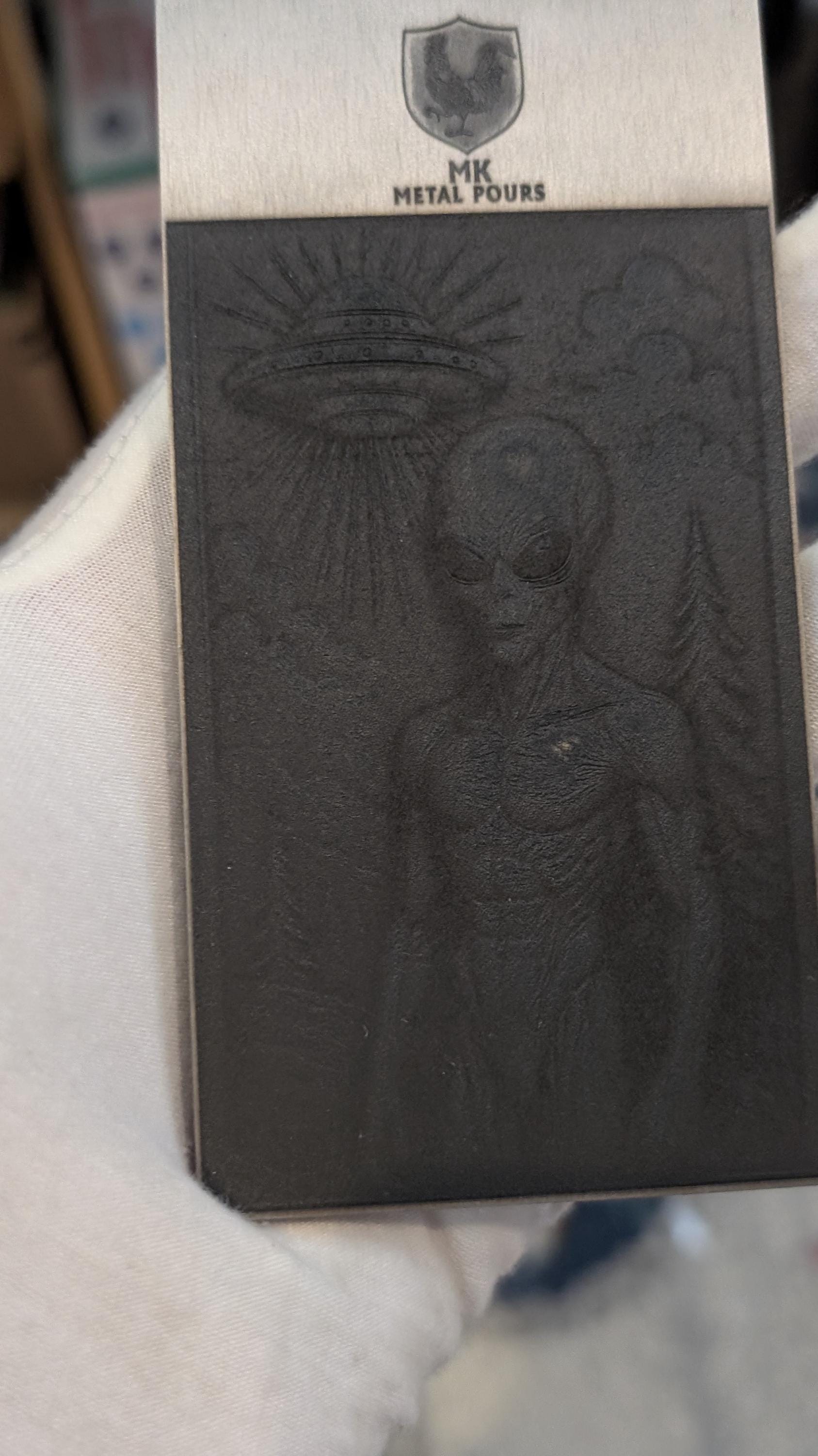Deep, high-contrast engraving — captures intricate alien and UFO details
