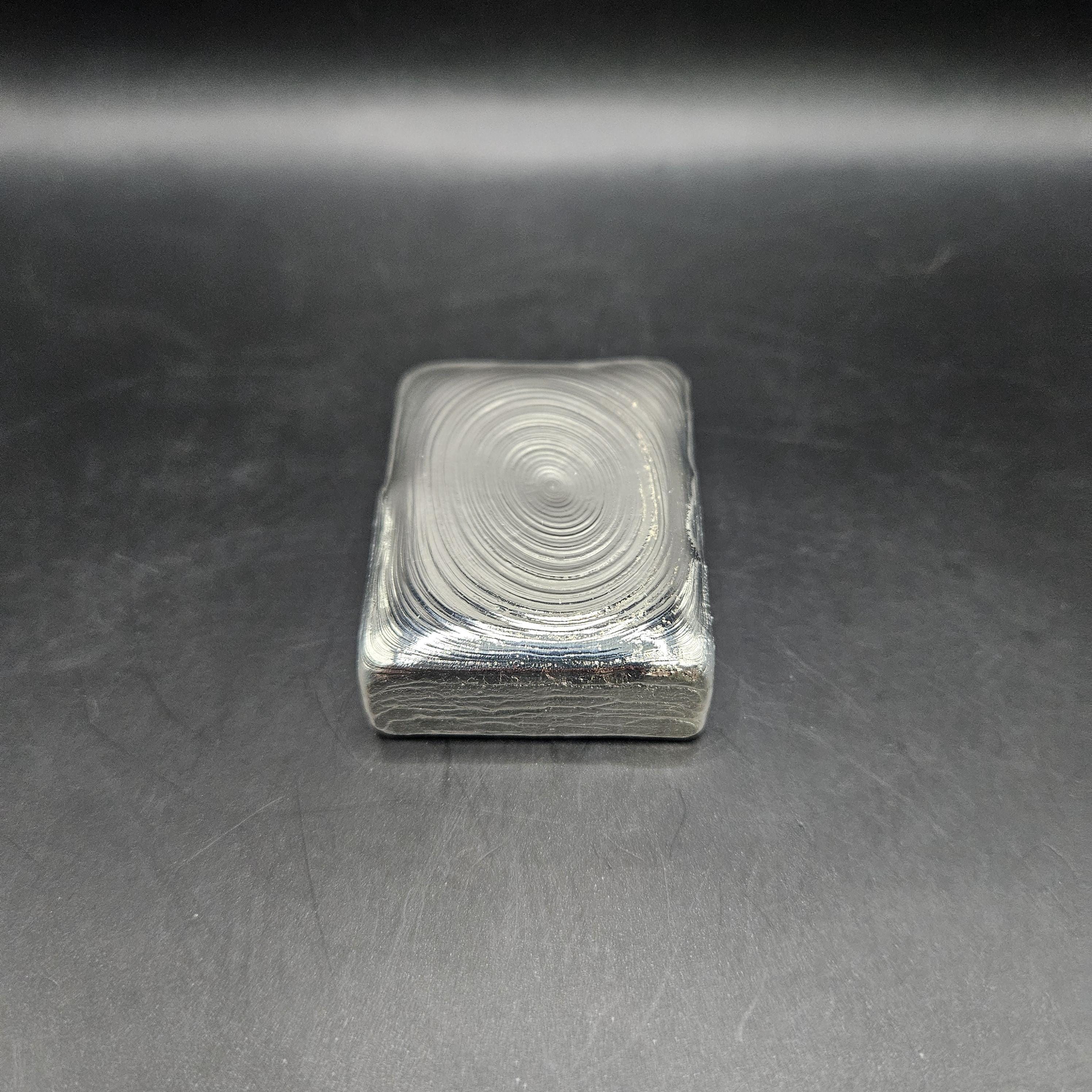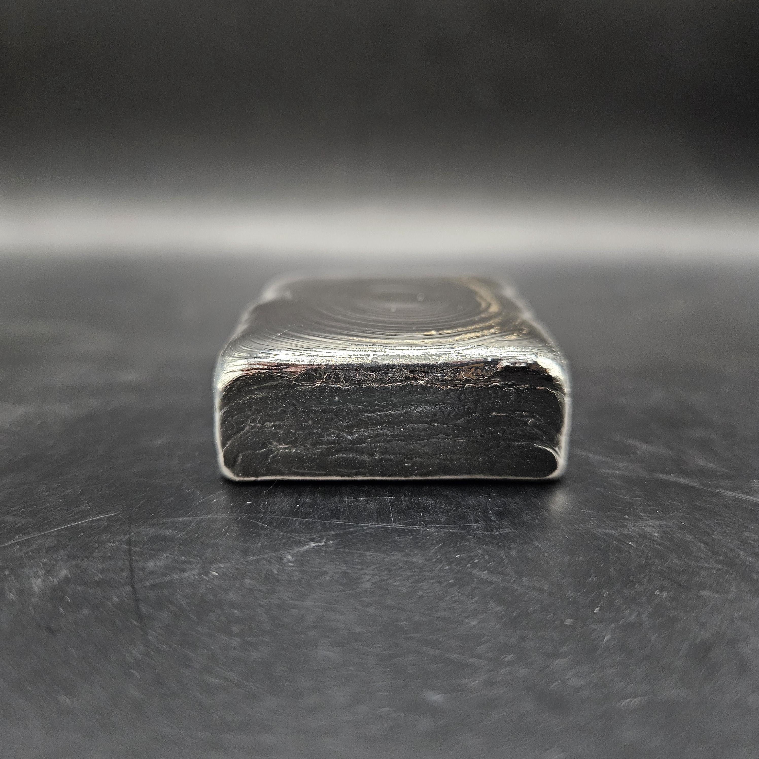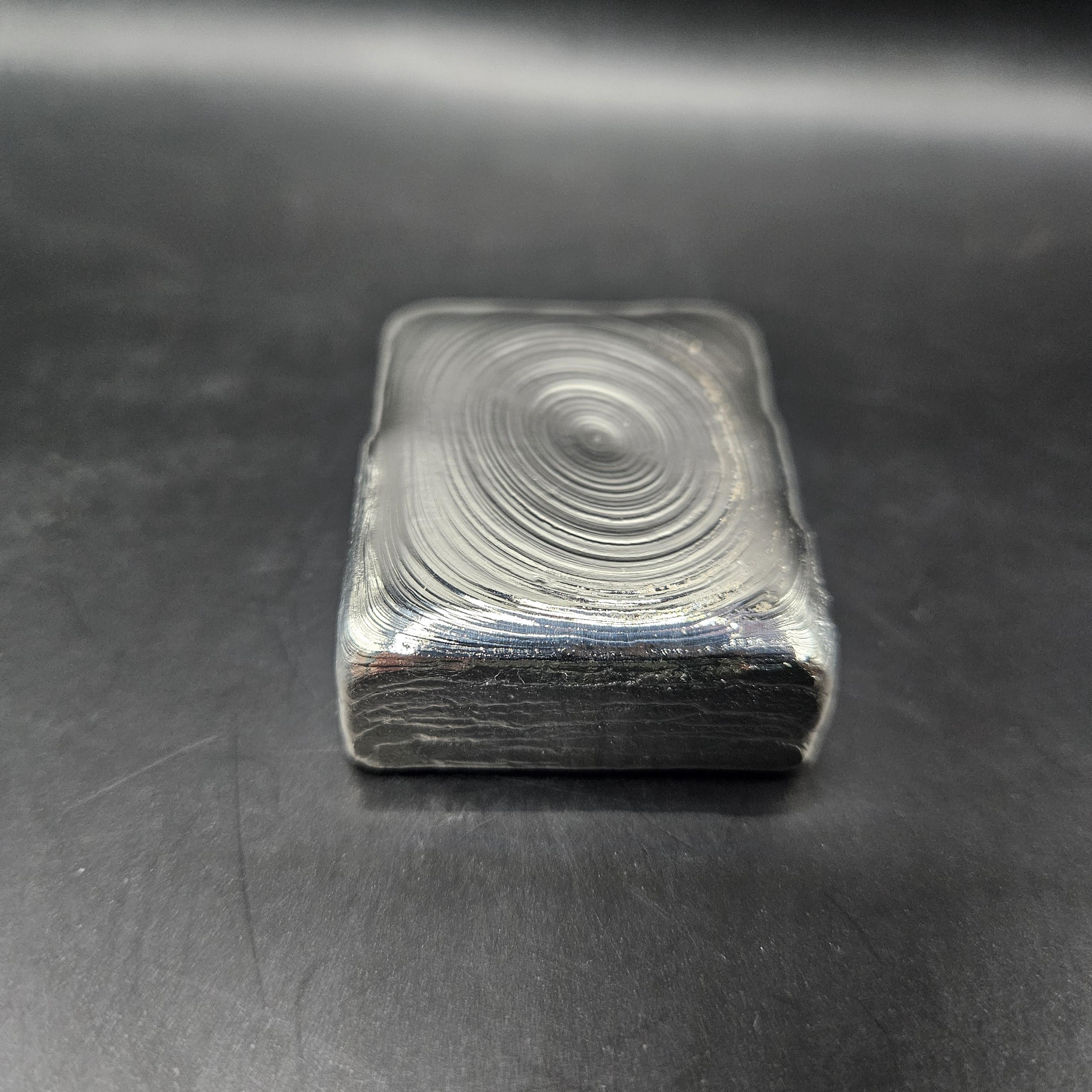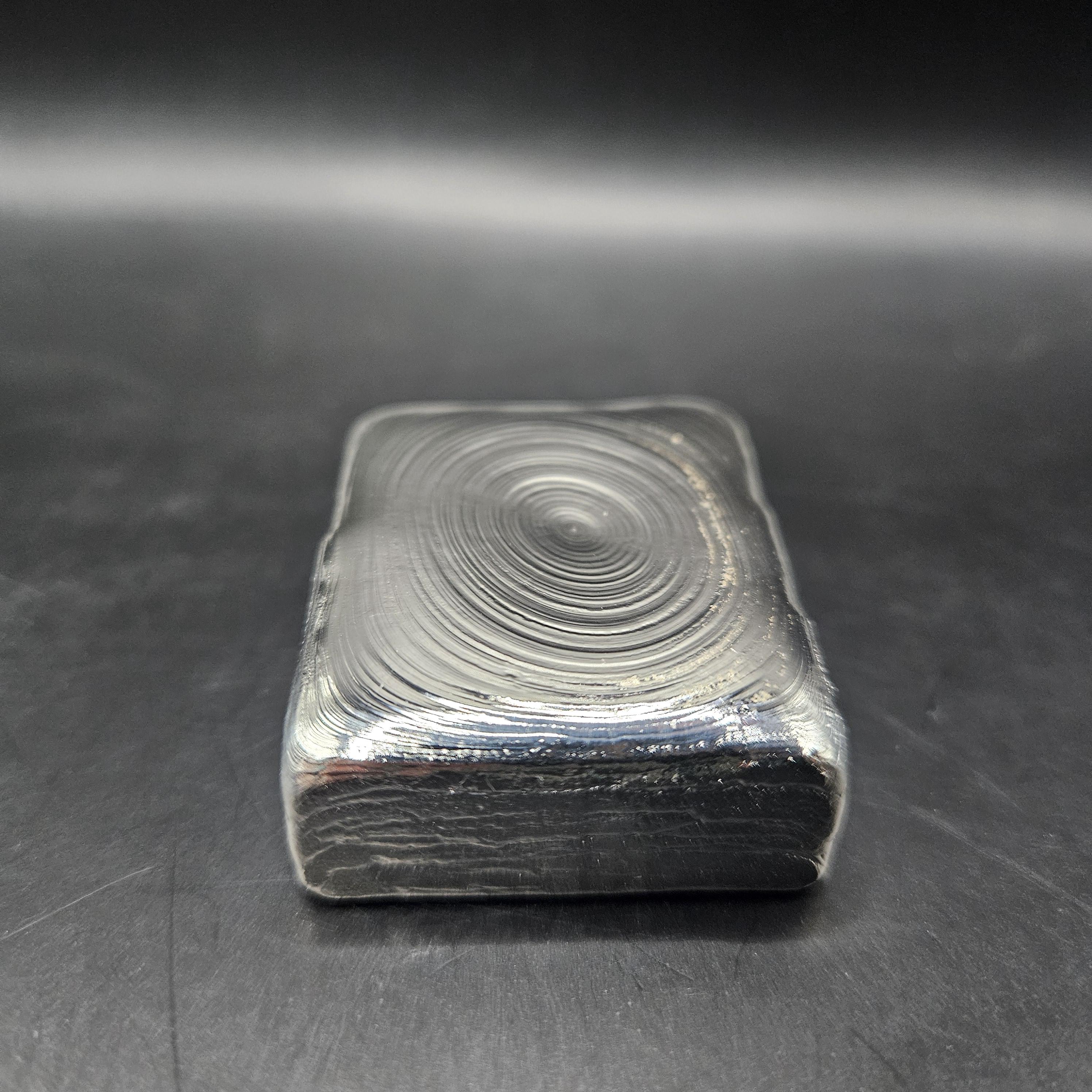 This one-of-a-kind 7 troy ounce hand-poured silver bar is a true piece of art. The top features gorgeous, hypnotic pour ripples created naturally during the pour; each ring capturing a moment of molten silver cooling into shape. The rear side has a rugged, textured artisan finish with a stamped design, giving it character and uniqueness you won’t find in mass produced bars.