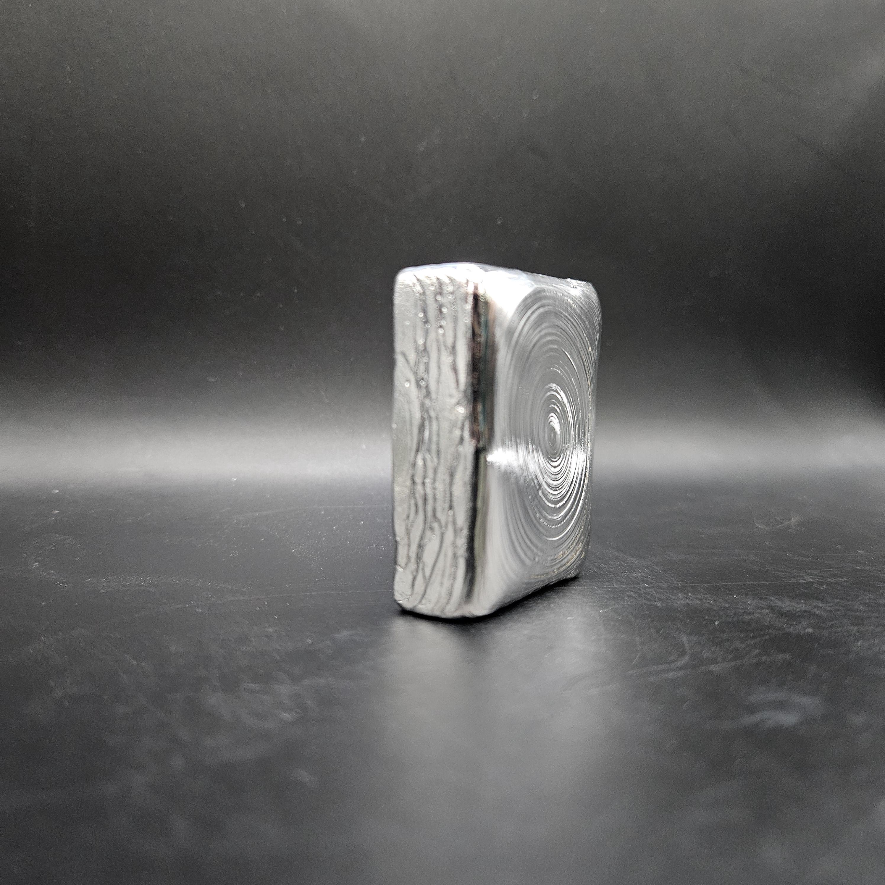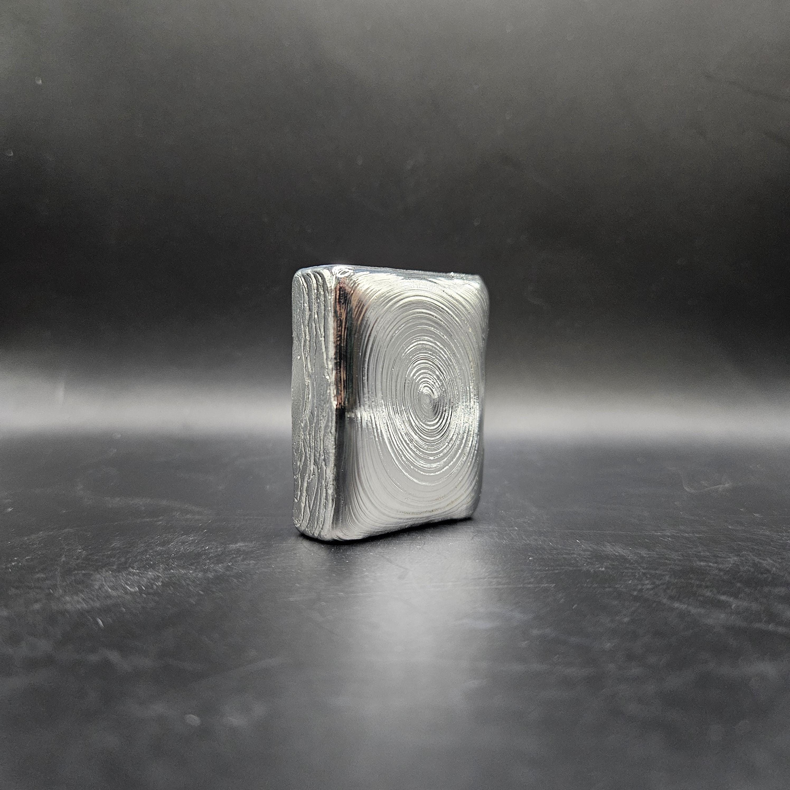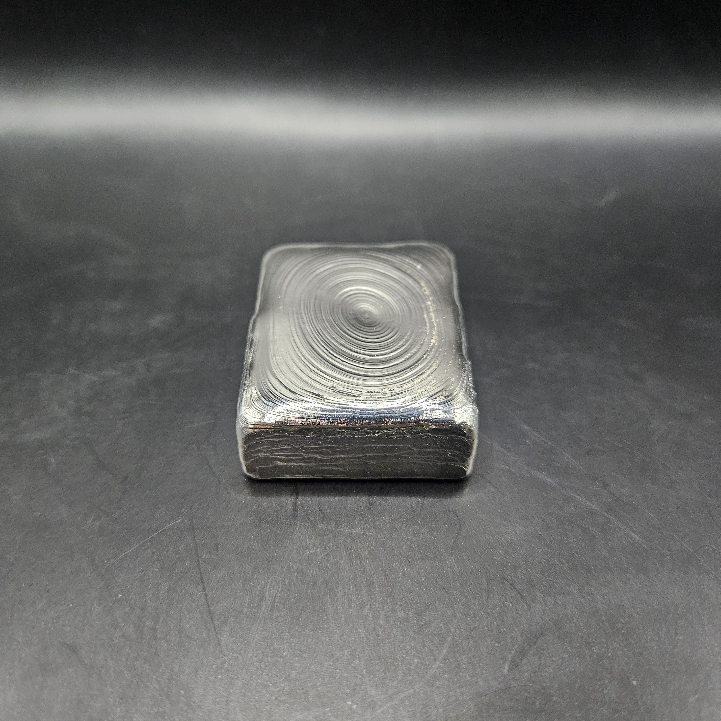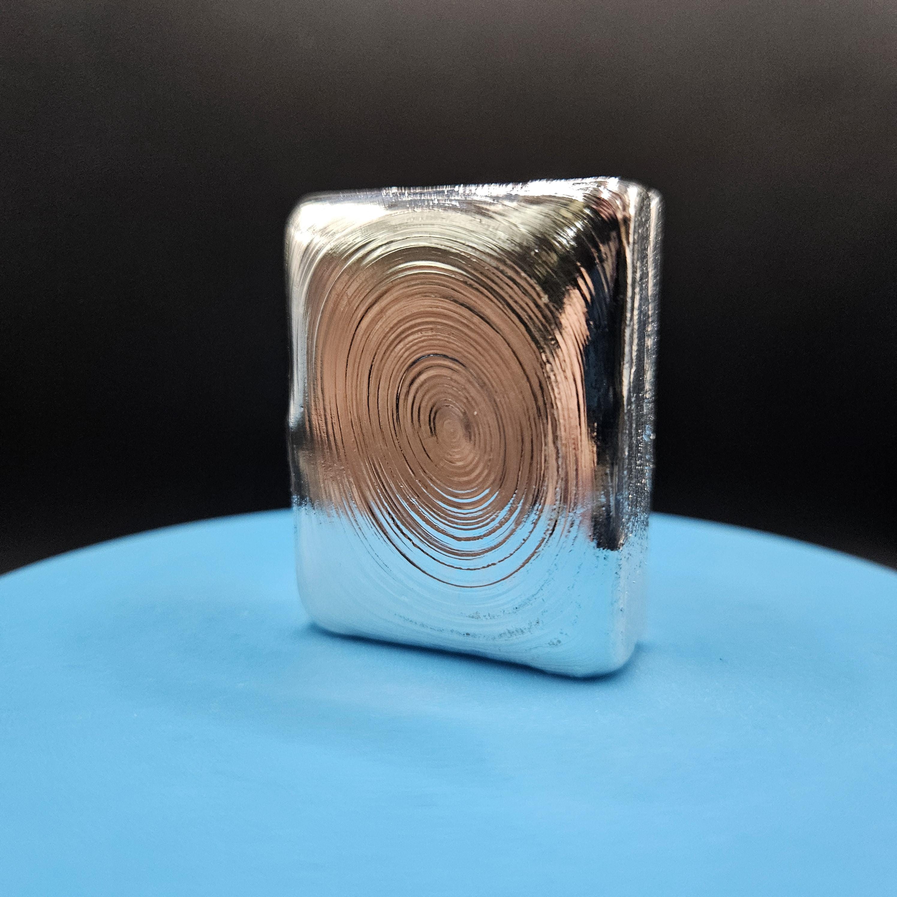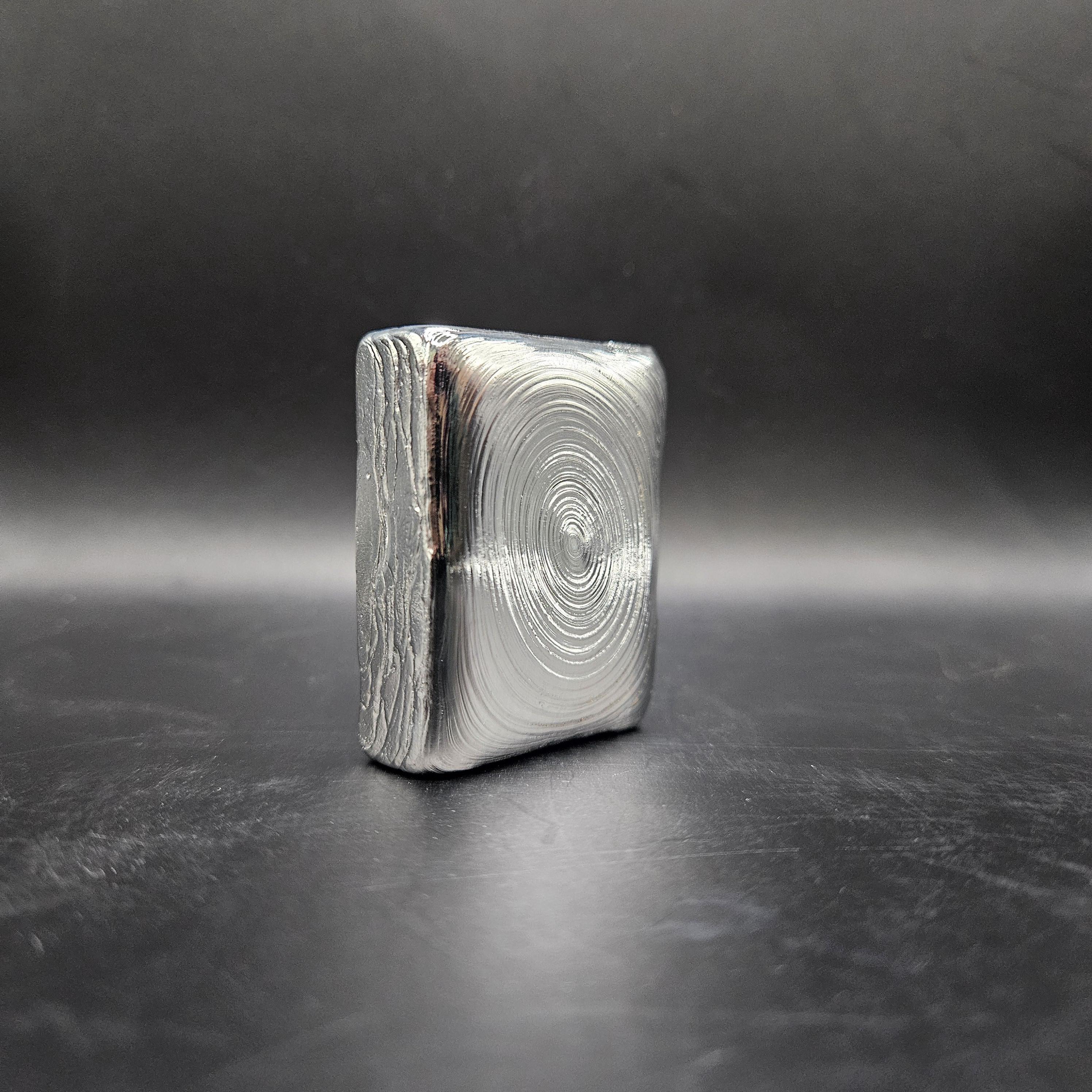This one-of-a-kind 7 troy ounce hand-poured silver bar is a true piece of art. The top features gorgeous, hypnotic pour ripples created naturally during the pour; each ring capturing a moment of molten silver cooling into shape. The rear side has a rugged, textured artisan finish with a stamped design, giving it character and uniqueness you won’t find in mass produced bars.