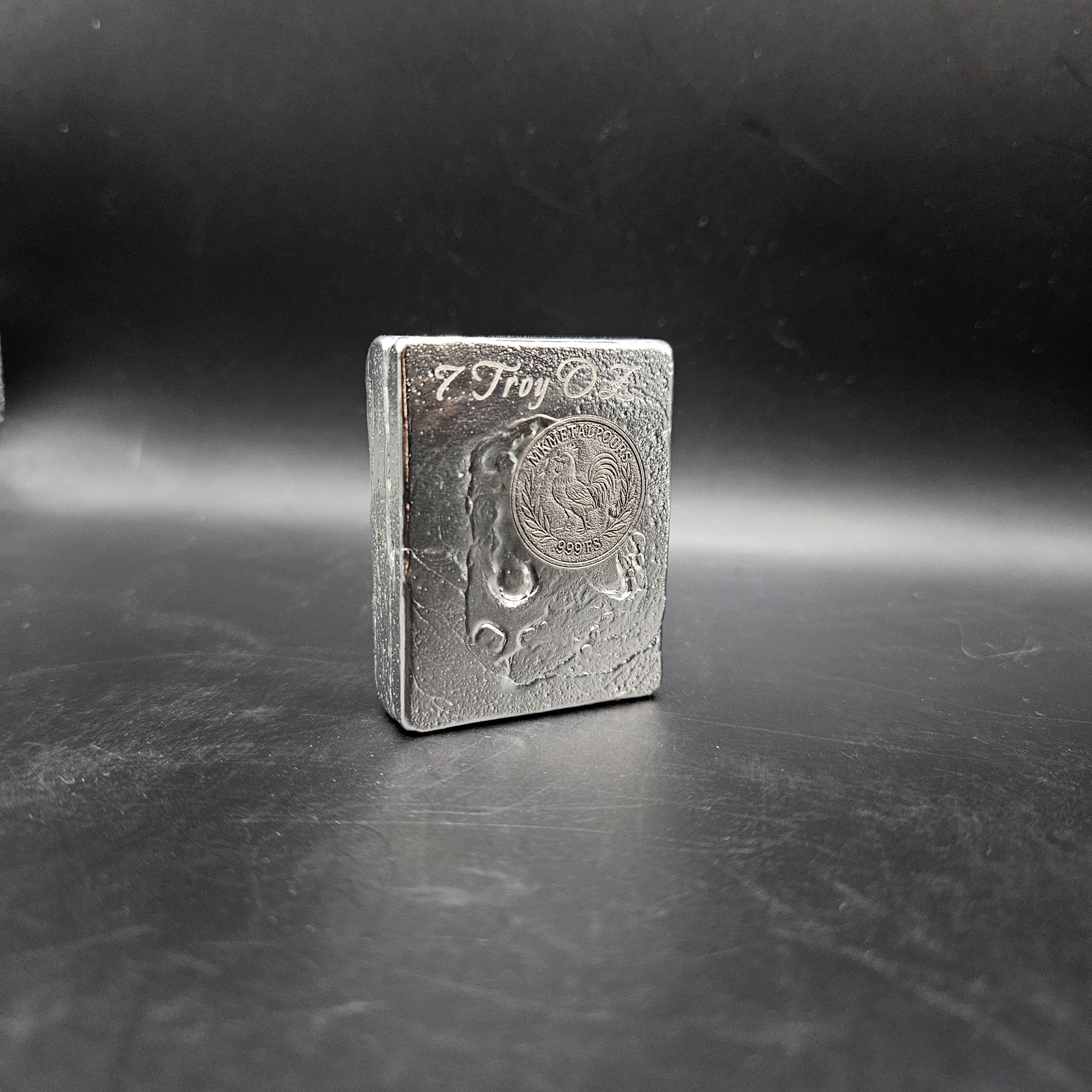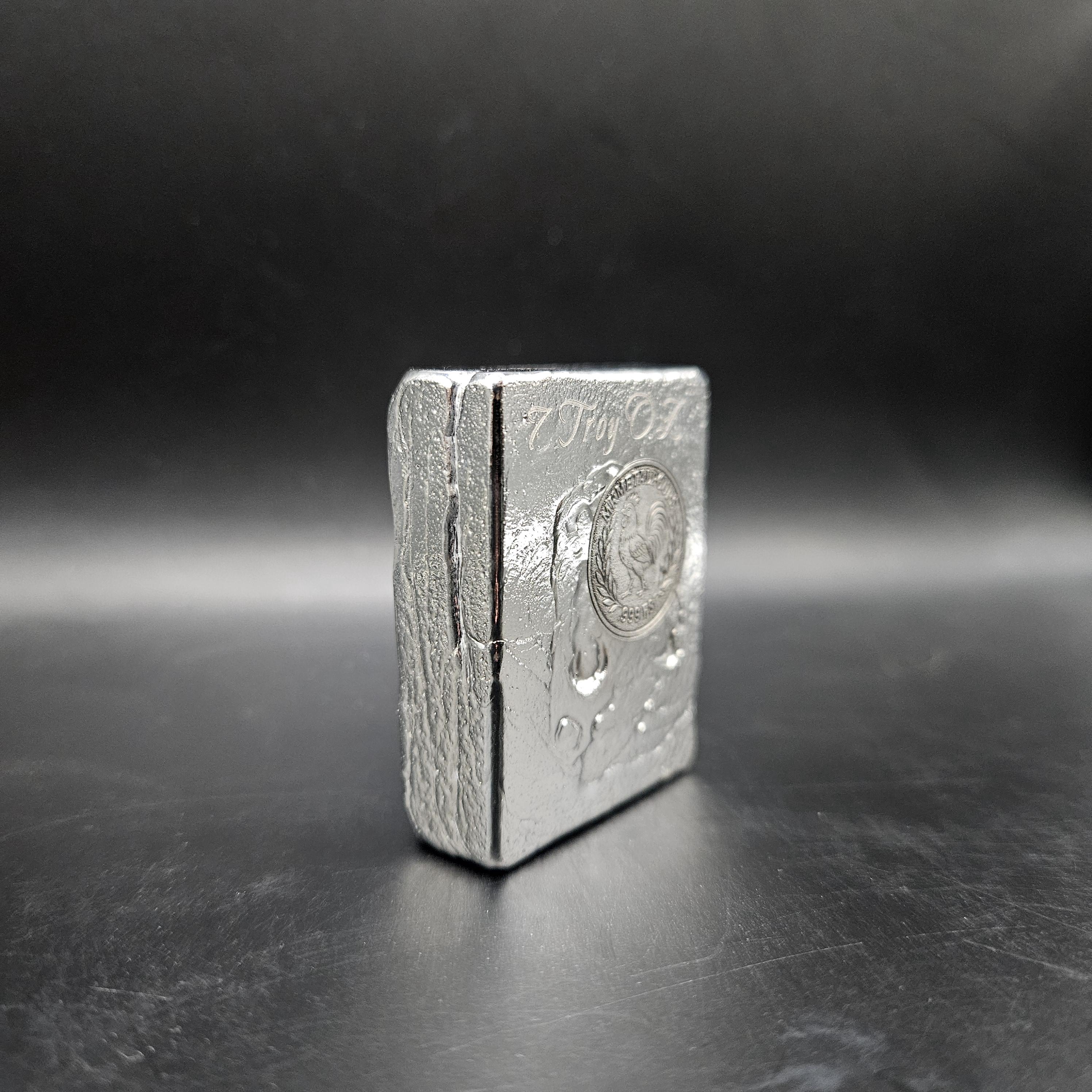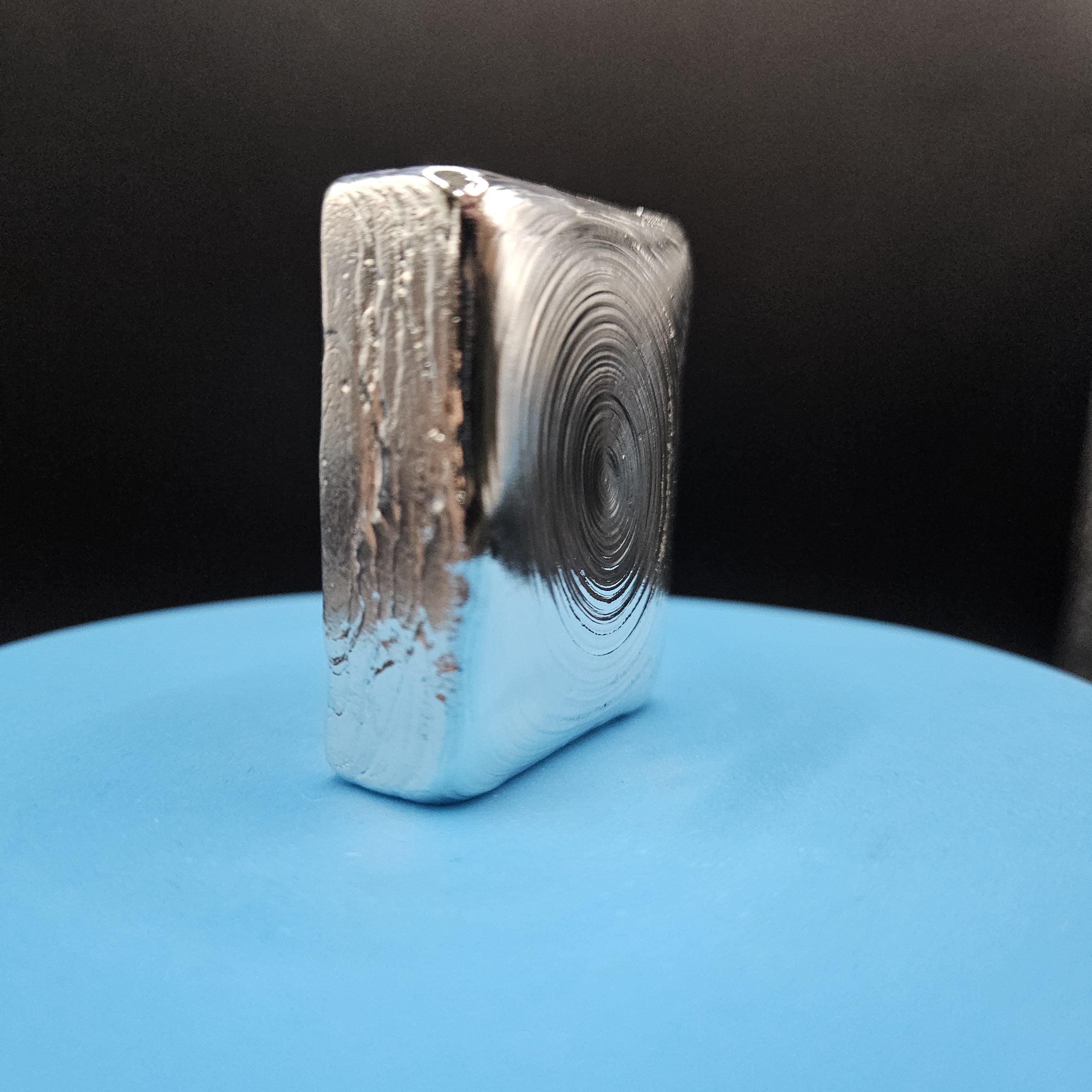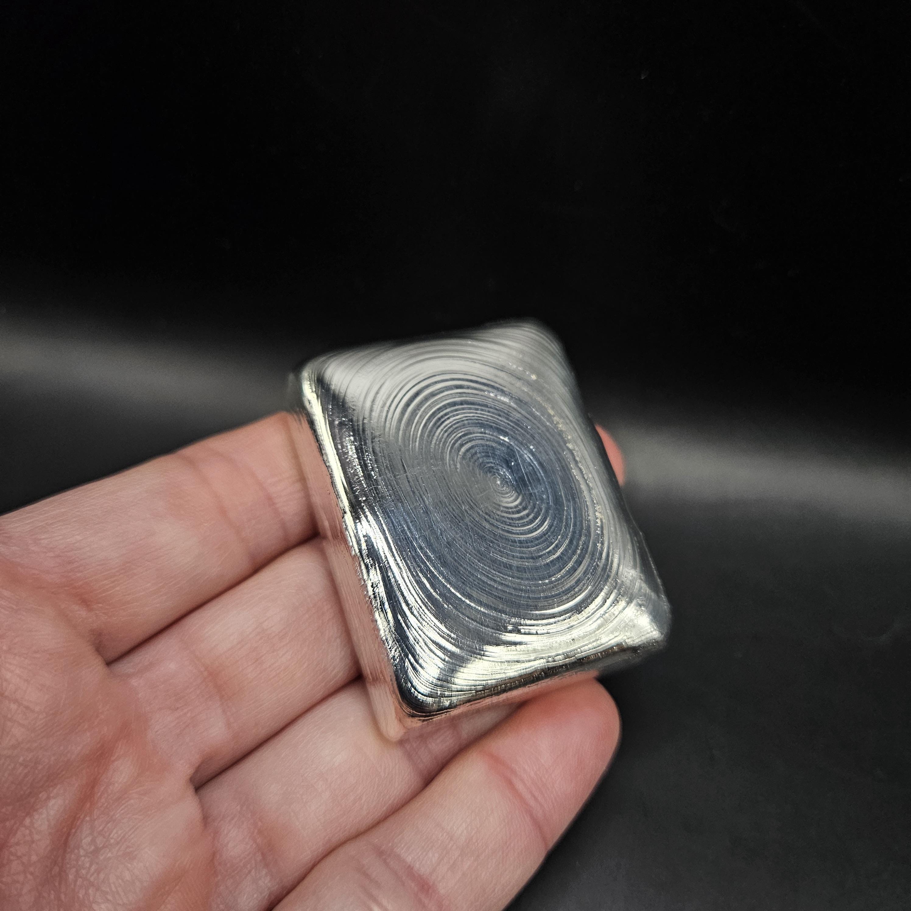 This one-of-a-kind 7 troy ounce hand-poured silver bar is a true piece of art. The top features gorgeous, hypnotic pour ripples created naturally during the pour; each ring capturing a moment of molten silver cooling into shape. The rear side has a rugged, textured artisan finish with a stamped design, giving it character and uniqueness you won’t find in mass produced bars.