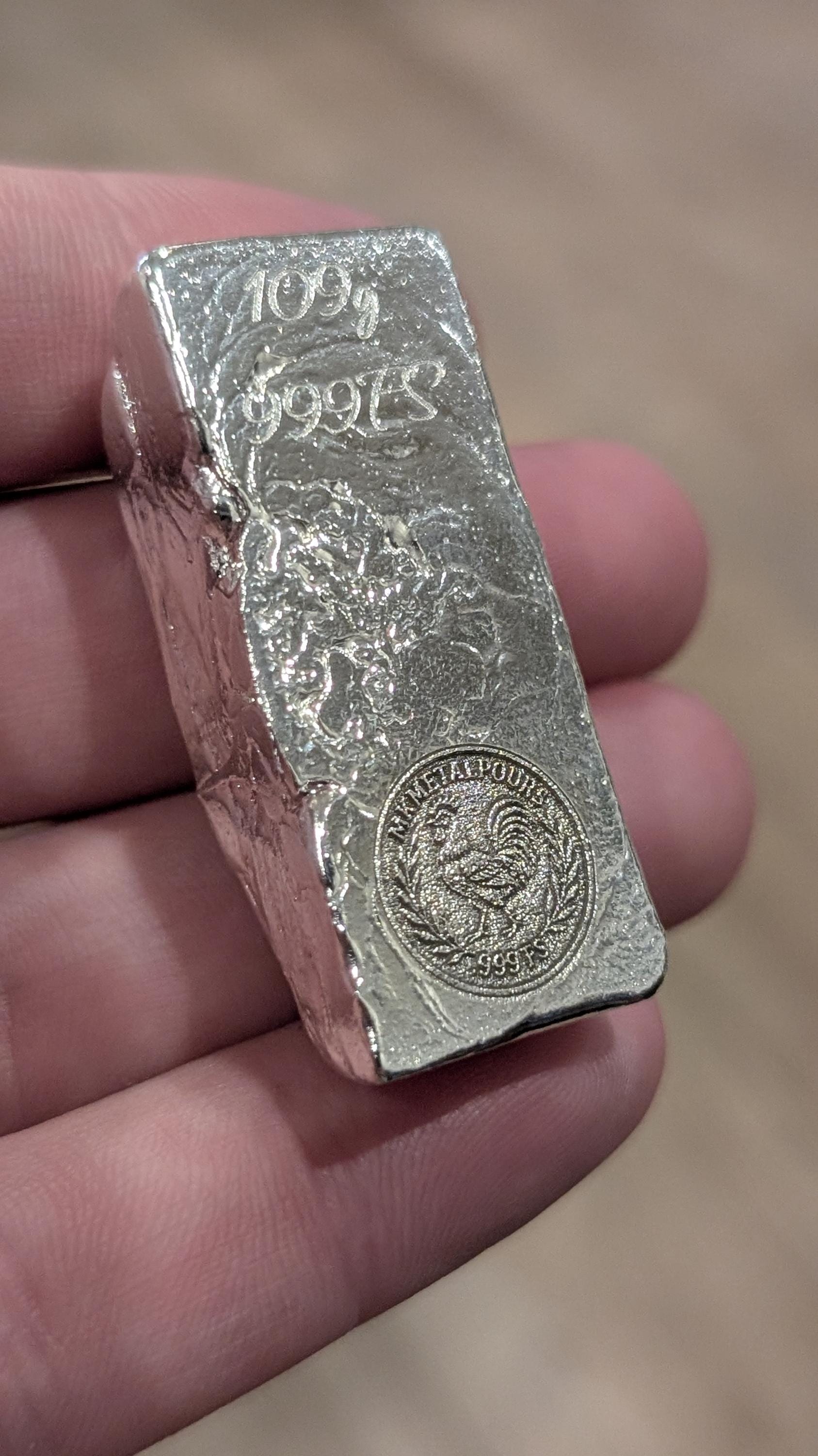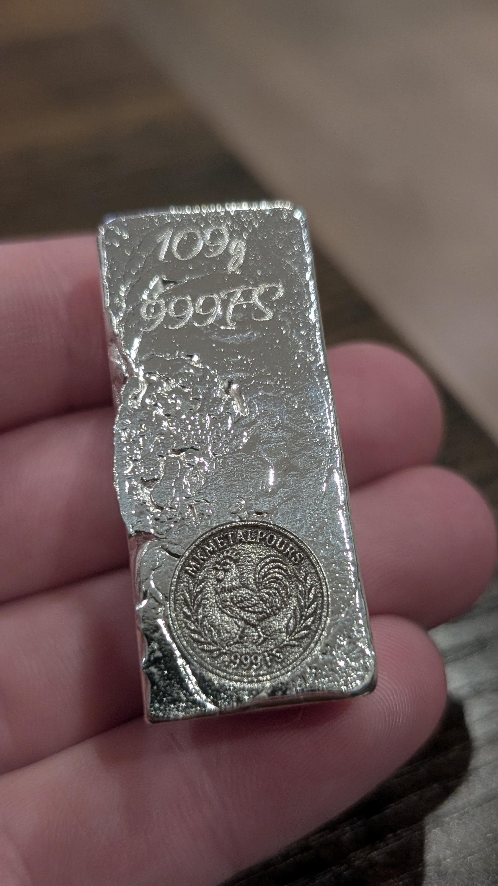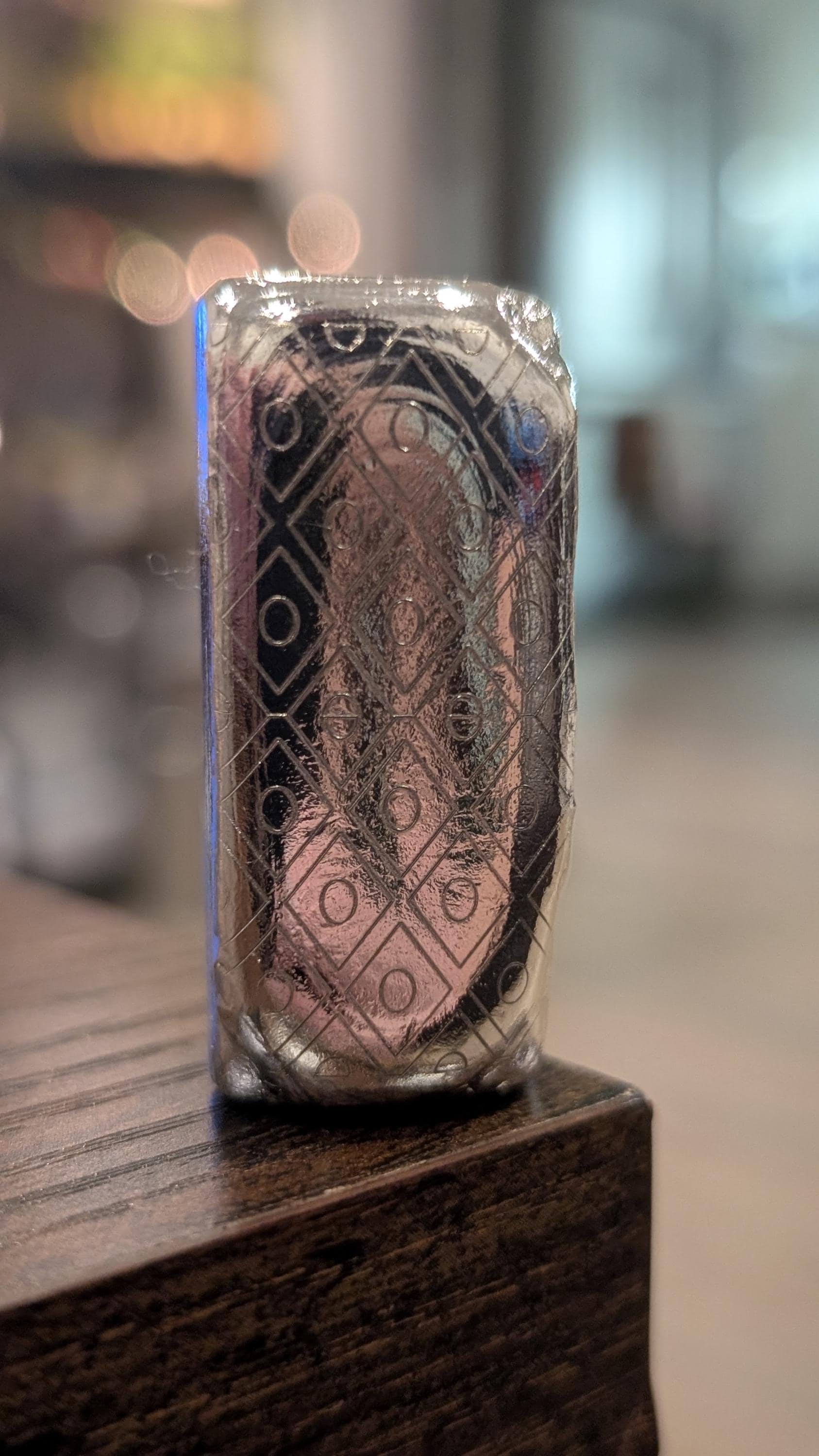 This fully engraved 109 gram hand poured silver bar from MKMetalPours brings serious weight and craftsmanship together in a single unique piece. Every bar is poured heavy, shaped naturally, and then engraved on all sides for a clean, premium look.
