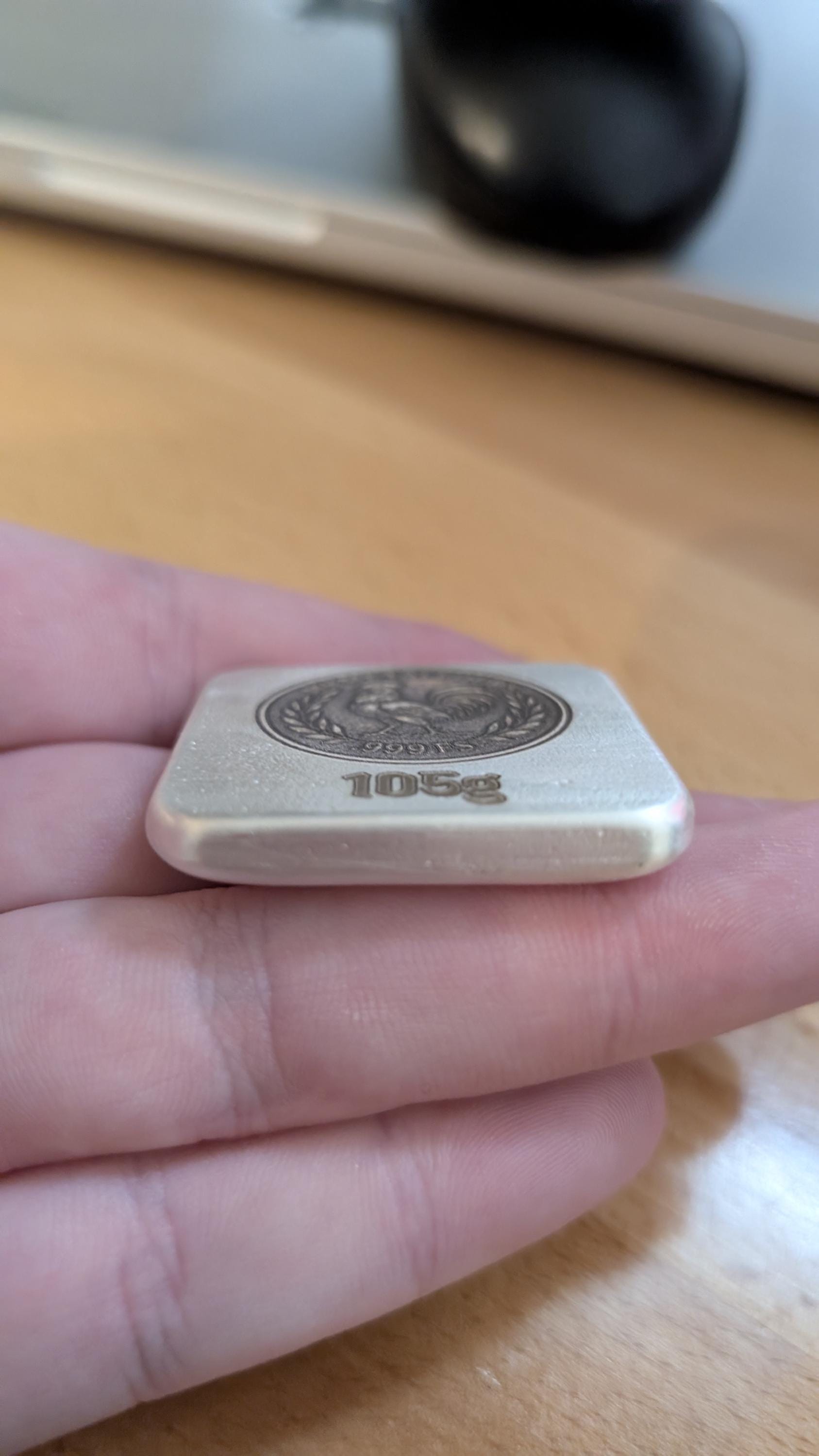 Each piece is individually poured, cooled, and finished by hand. That means no two bars are ever exactly alike. The front features the MKMetalPours rooster crest with “999 FS” and an engraved weight stamp of 105g. The reverse has a bright, polished finish with natural pour character and subtle surface variation that proves it’s the real thing, not factory-perfect boredom.
