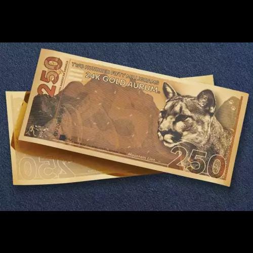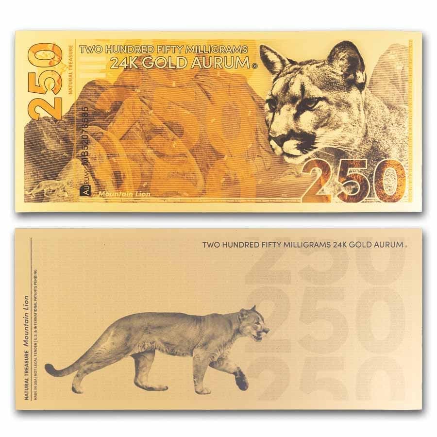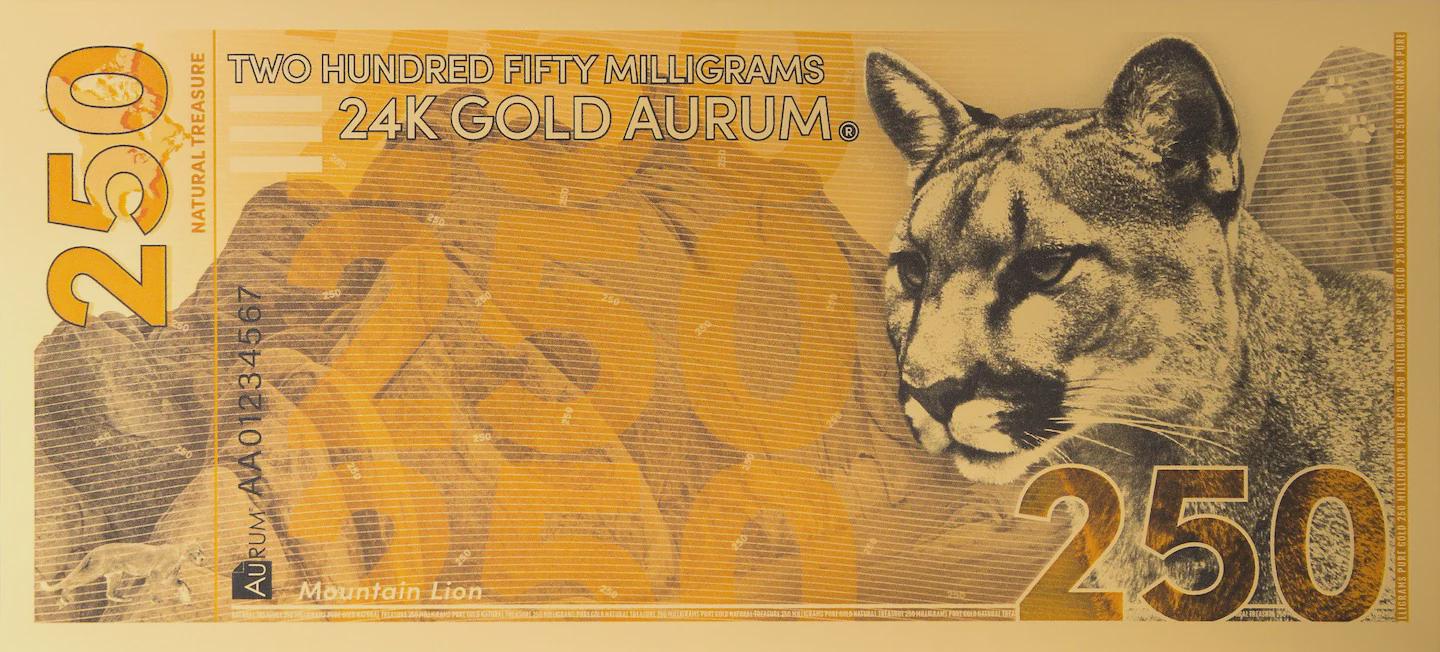 Bring a little wild power to your stack with the Aurum Natural Treasures Mountain Lion Gold Note. This piece contains 250 milligrams of .999 fine gold in a sleek, currency style format that displays beautifully and stores easily.