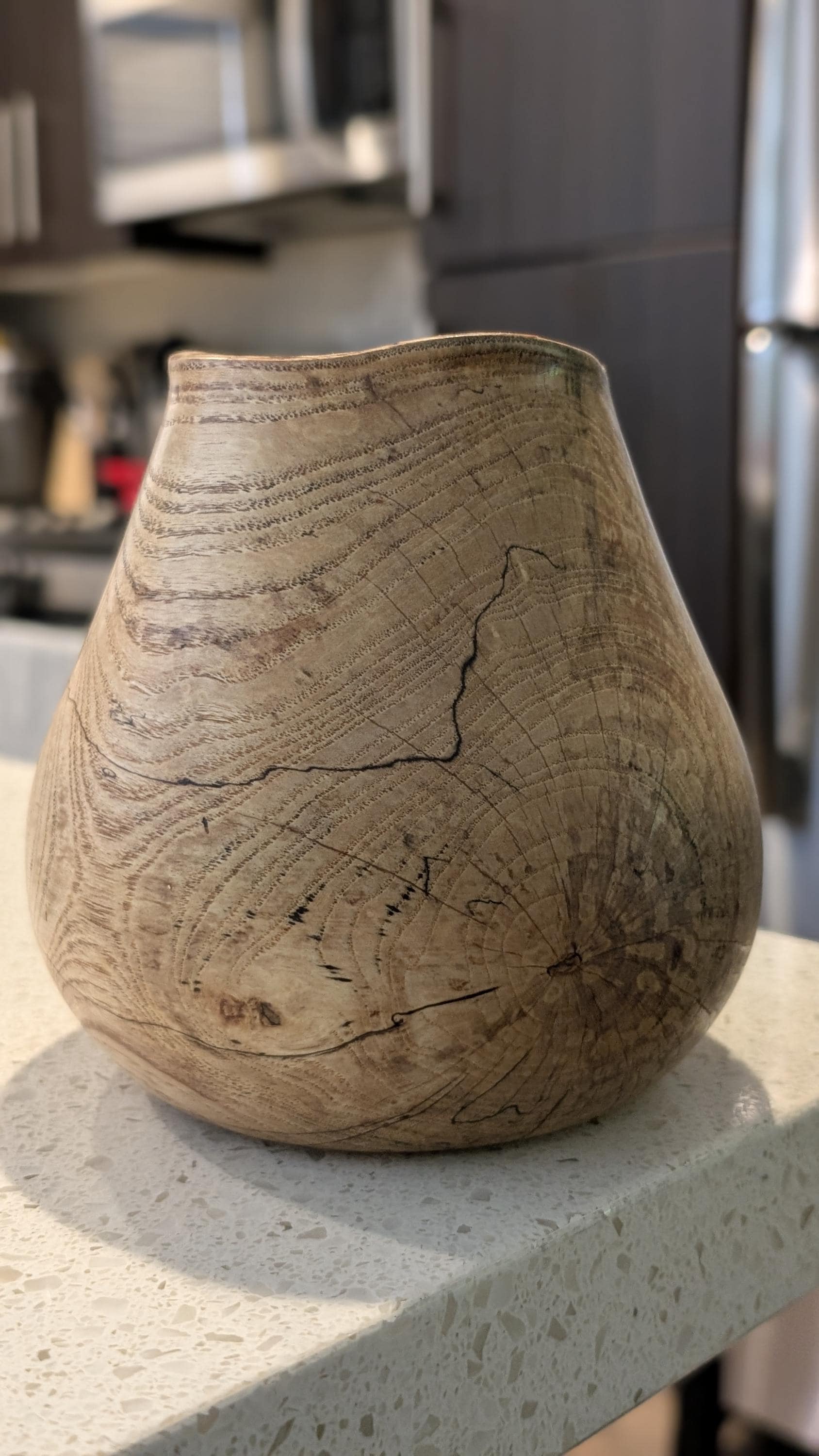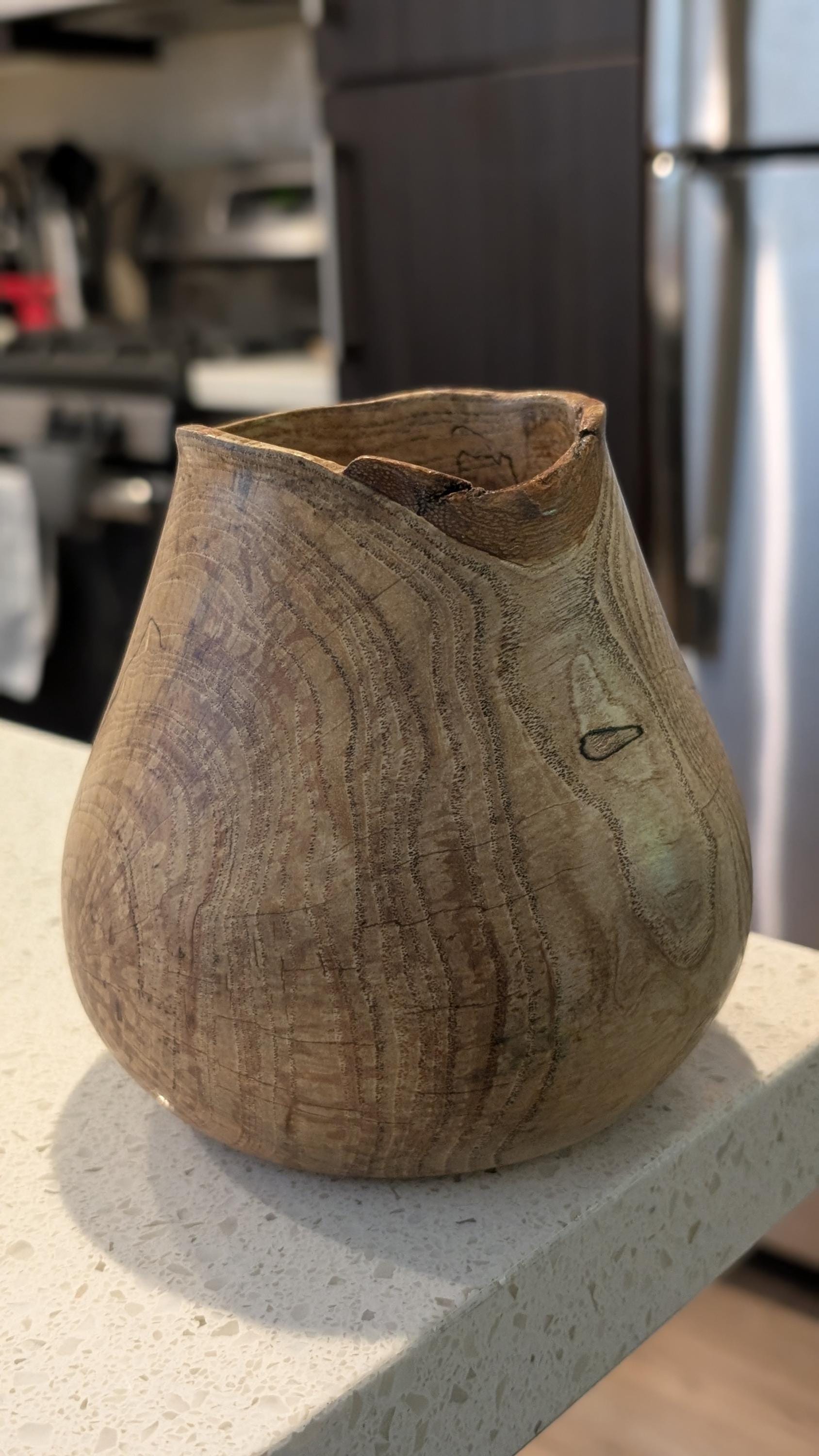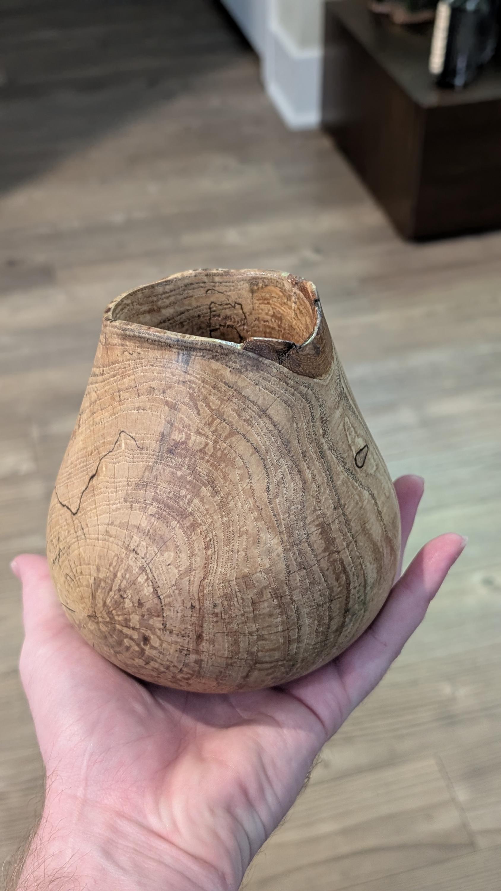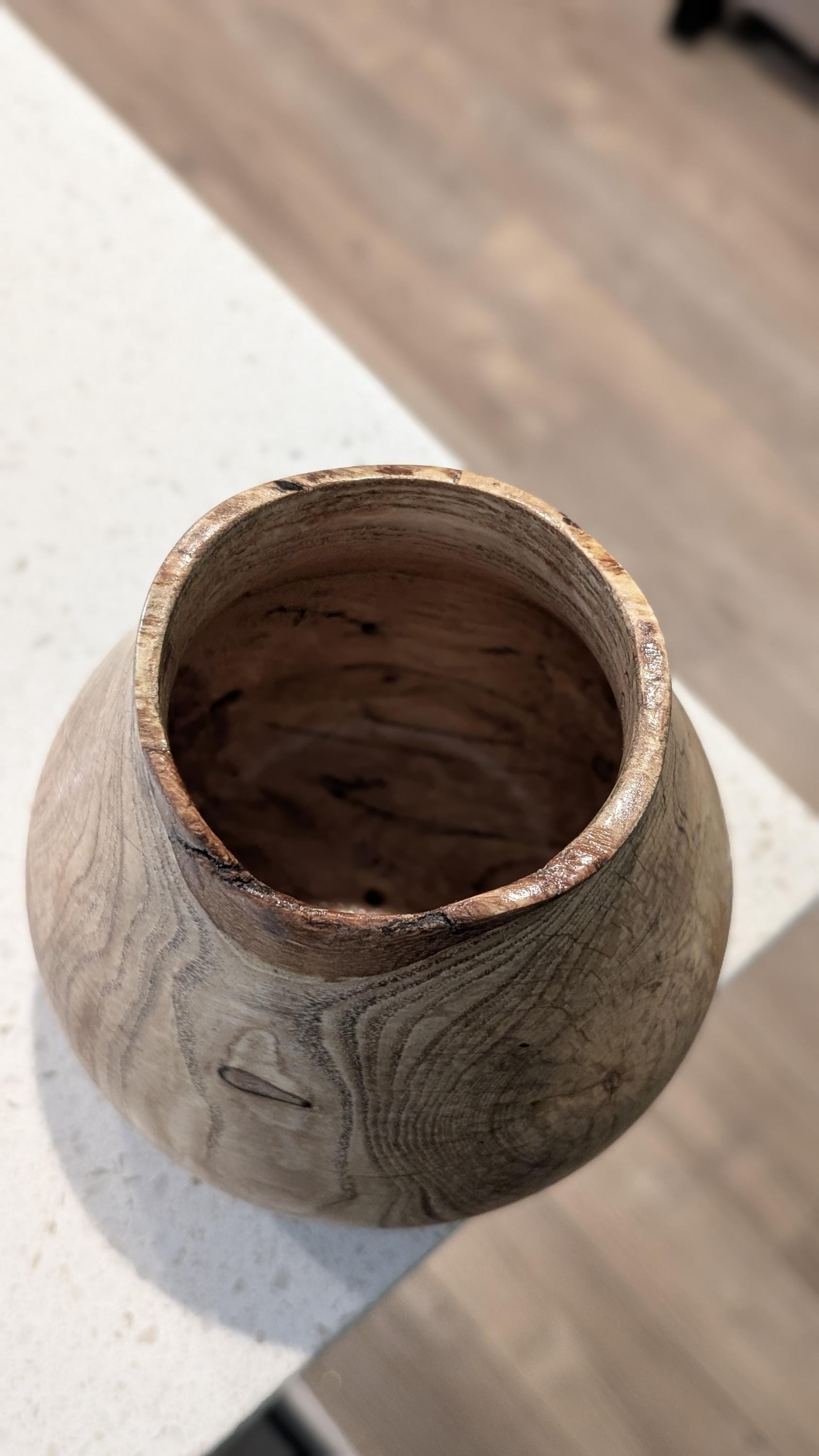Each curve and grain line in this piece tells its own story. The bowl features a rounded, sculptural form with a softly flowing natural rim, rich grain movement, and beautiful dark spalting throughout. The result is a piece that feels earthy, warm, and completely unique.